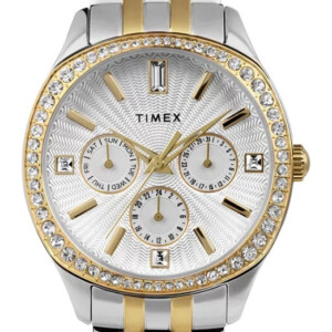 Zegarek damski Timex model TW2W17900 to doskonały przykład na to, jak funkcjonalność może iść w parze z elegancją. Mosiężna koperta o średnicy 36 mm, pozłacana za pomocą technologii PVD w kolorze żółtego złota, doskonale komponuje się z dwukolorową bransoletą i cyrkoniami zdobiącymi tarczę. Mineralne szkło zapewnia trwałość i odporność na zarysowania, co czyni zegarek nie tylko pięknym, ale i praktycznym dodatkiem. Styl Fashion marki Timex podkreśla nowoczesną estetykę, która idealnie wpisuje się w potrzeby współczesnej kobiety. Jasna tarcza z fluoerscencyjnymi wskazówkami i datownikiem wskazuje na dbałość o każdy detal, co jest wyrazem prestiżu i jakości, jaką gwarantuje Timex.