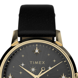 Zegarek damski Timex model TW2W21200 to kwintesencja elegancji i współczesnego designu. Jego klasyczna, okrągła koperta o średnicy 38mm, wykonana z wysokiej jakości stali szlachetnej, pokryta jest metodą PVD/IP, co dodaje luksusowego wykończenia w odcieniach żółtego złota. Czarna, skórzana bransoleta starannie komponuje się z ciemną tarczą, zdobioną cyrkoniami, które dodają subtelnej, ale wyraźnej błyskotliwości. Szkło hesalitowe zapewnia ochronę i trwałość, a funkcje takie jak open heart dodają zegarkowi unikalnego charakteru, ukazując część mechanizmu automatycznego, co podkreśla innowacyjność i styl marki Timex.