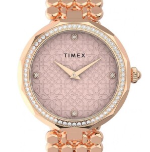 Zegarek damski Timex model TW2V02800, wykończony w odcieniach różowego złota z delikatnymi zdobieniami z cyrkonii, emanuje stylem „Fashion”, który idealnie odzwierciedla najnowsze trendy w modzie. Okrągła koperta o średnicy 34 mm, wykonana ze stali szlachetnej i pokryta techniką PVD/IP, zachowuje doskonały połysk i oferuje wytrzymałość, co podkreśla wartość marki Timex. Jasna tarcza w połączeniu z elegancką, pozłacaną bransoletą tworzy klasyczny, ale też nowoczesny akcent, czyniąc zegarek idealnym dodatkiem do dziennych i wieczorowych stylizacji.