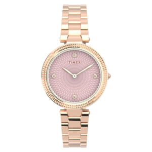 Timex, znaną marką o długiej historii, prezentuje model TW2V24300, który łączy elegancję z nowoczesnością w segmencie damskich zegarków. Zastosowanie koperty o średnicy 32mm wykonanej z pozłacanej stali szlachetnej w kolorze różowego złota dodaje blasku i prestiżu. Jasna tarcza zdobiona cyrkoniami harmonijnie współgra z high-fashion designem, podkreślającym kobiecy charakter właścicielki. Odporność na wodę do 50m oraz wytrzymałe szkło mineralne czynią ten zegarek nie tylko stylowym, ale i praktycznym dodatkiem na każdą okazję.