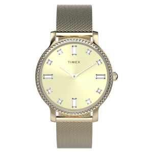 Zegarek damski Timex model TW2W19300 zachwyca swym eleganckim wyglądem, który łączy modny styl z klasyczną elegancją. Pozłacana bransoleta i koperta z mosiądzu w kolorze żółtego złota dodają blasku, a cyrkonie zdobiące tarczę subtelnie podkreślają luksusowy charakter. Jasna, czytelna tarcza osadzona jest w solidnie wykonanej, okrągłej kopercie o średnicy 34mm, zaś mineralne szkło chroni zegarek przed zarysowaniami. Dzięki zastosowaniu nowoczesnej technologii nanoszenia koloru PVD/IP, złocenie jest trwałe i wytrzymałe. Wodoodporność do 30m zapewnia ochronę przed przypadkowym zamoczeniem, co czyni zegarek doskonałym wyborem na co dzień. Timex, jako marka z ugruntowaną pozycją, gwarantuje wysoką jakość i styl, idealnie wpisując się w modowy kanon.