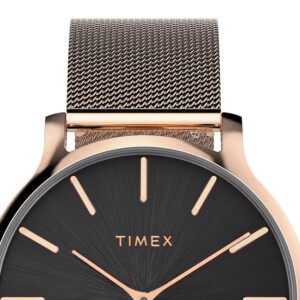 Damski zegarek Timex model TW2W19600 połączy w sobie długotrwałą elegancję z nowoczesną funkcjonalnością, co czyni go doskonałym wyborem dla miłośniczek fashion. Obudowa z mosiądzu zapewnia wytrzymałość, a pozłacenie w kolorze różowego złota dodaje luksusu i subtelnego blasku. Ciemna tarcza harmonijnie kontrastuje z jasnymi akcentami, tworząc stylowy, ale czytelny zegarek. Okrągły kształt koperty i mineralne szkło skutecznie chronią mechanizm kwarcowy, jednocześnie zapewniając elegancki wygląd na nadgarstku. Bransoleta w kolorze czarnym z różowym złotem zdobiącym dokonuje finalnego akcentu w kreacji, podkreślając unikalny charakter marki Timex.
