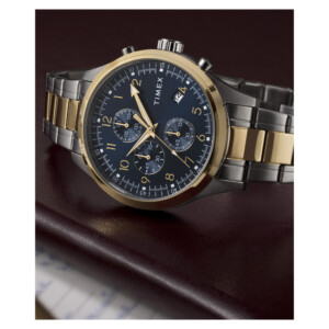 Zegarek Timex model TW2Y01500 doskonale odzwierciedla sportowy styl i wysoką jakość, które są znakiem rozpoznawczym marki Timex. Niebieska tarcza, elegancko połączona z dwukolorową bransoletą wykonaną ze stali szlachetnej, nadaje temu modelowi wyrazisty, lecz równocześnie uniwersalny charakter. Solidna okrągła koperta o średnicy 43mm i grubości 11mm, wraz z mineralnym szkłem zapewniają trwałość i odporność na codzienne użytkowanie. Wodoodporność do 50m czyni go idealnym towarzyszem podczas powierzchniowych aktywności wodnych, co w połączeniu z funkcjami chronografu i datownika czyni ten zegarek nie tylko atrakcyjnym, ale i funkcjonalnym dodatkiem.
