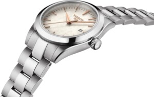 Tissot T-MY LADY T132.010.11.111.00 - efektowna tarcza tego zegarka damskiego marki Tissot, w połączeniu ze srebrną bransoletą, nadają urządzeniu efektowną i urokliwą całość. Ten nietuzinkowy design i pozłacane w kolorze różowego złota indeksy na tarczy przyciągną uwagę wszystkich dookoła, jednak wygląd to nie jedyna zaleta tego produktu.Model Tissot T-MY LADY T132.010.11.111.00 został napędzony za pomocą mechanizmu kwarcowego, zasilanego wytrzymałą baterią, której żywotność sięga nawet do 3 lat. Bransoletę i kopertę zegarka producenci wykonali precyzyjnie za pomocą stali szlachetnej, natomiast tarczę, która ukazuje wszystkie najważniejsze informacje, pokryto w całości szkłem szafirowym wraz z masą perłową. Poszczególne elementy urządzenia ozdobiono brylantami. Produkt posiada oryginalnie wbudowaną funkcję datownika, której zadaniem jest ukazywanie użytkowniczce aktualnego dnia miesiąca. Wodoszczelność zegarka oceniono w klasie 50m. Producent odgórnie nakłada na produkt dwuletnią gwarancję.