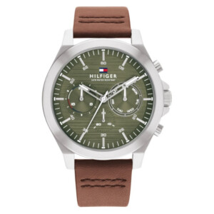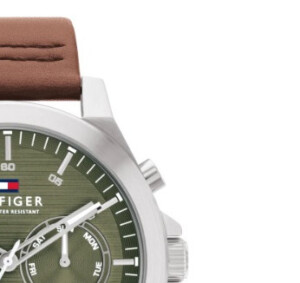 Zegarek męski Tommy Hilfiger o numerze modelu 1710522 łączy w sobie elegancję i nowoczesny design, charakterystyczny dla marki Tommy Hilfiger. Okrągła koperta o średnicy 46 mm, wykonana ze stali szlachetnej, zwraca uwagę swoim stylowym połączeniem kolorów brązowego, srebrnego i zielonego. Ciemna tarcza harmonizuje z brązowym, skórzanym paskiem, nadając zegarkowi klasyczny, ale i modny wygląd. Fluorescencyjne wskazówki oraz indeksy poprawiają czytelność czasu nawet w słabym oświetleniu, co potęguje jego funkcjonalność. Styl Fashion, którym charakteryzuje się ten model, podkreśla modowy charakter, czyniąc go idealnym akcentem do casualowych, jak i bardziej formalnych strojów.