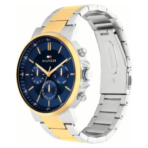 Zegarek męski Tommy Hilfiger o modelu 1710710 to doskonały wybór dla tych, którzy cenią sobie połączenie elegancji i sportowego charakteru. Wyposażony w ciemnoniebieską tarczę z liniowymi indeksami, okrągłą kopertę o średnicy 44mm wykonaną ze stali szlachetnej w kolorze srebrnym i żółtym, zegarek emanuje luksusem świetnie komponującym się z dynamicznym stylem życia. Bransoleta w tych samych barwach dodatkowo podkreśla nowoczesny, lecz jednocześnie klasyczny wygląd, idealnie odzwierciedlając prestiż marki Tommy Hilfiger.