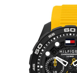 Zegarek męski Tommy Hilfiger model 1792235 to doskonały wybór dla panów ceniących równowagę między elegancją a sportowym zacięciem. Ciemna, czarna tarcza zestawiona z okrągłą, czarną kopertą o średnicy 44mm i grubości 12mm prezentuje się wyjątkowo stylowo i nowocześnie. Całość uzupełnia żółty, gumowy pasek, który nie tylko dodaje dynamicznego charakteru, ale także zapewnia komfort noszenia i wytrzymałość. To znakomite połączenie sportowej funkcjonalności z eleganckim designem, które jest cechą rozpoznawalną marki Tommy Hilfiger, znanej z dbałości o detale i luksusowego wykończenia.