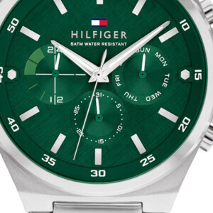 Zegarek męski Tommy Hilfiger, model 1792088, to kwintesencja stylu oraz elegancji, jaki promuje marka. Efektowny, z okrągłą kopertą o średnicy 46mm, wykonaną z wytrzymałej stali szlachetnej, jest nie tylko praktyczny, ale i modny. Zegarek charakteryzuje się ciekawą kolorystyką – srebrny korpus zestawiony z ciemną tarczą i akcentami w kolorze zielonym dodaje urządzeniu nowoczesności. Mineralne szkło pokrywające tarczę zapewnia wysoką odporność na zarysowania, co razem z wodoodpornością do 50m czyni zegarek odpowiednim wyborem dla aktywnych mężczyzn. Dodatkowo, dzięki funkcji datownika oraz fluorescencyjnym wskazówkom przydatność tego zegarka rozciąga się na różne sytuacje, czyniąc go idealnym partnerem na co dzień.