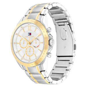 Damski zegarek Tommy Hilfiger o modelu 1782555 jest doskonałym przykładem elegancji połączonej z nowoczesnością, charakterystyczną dla marki znanej z jej bezkompromisowego podejścia do stylu 'Fashion'. Okrągła koperta o średnicy 40mm, wykonana ze stali szlachetnej i wykończona w odcieniach srebra oraz żółtego złota, nadaje temu zegarkowi luksusowego charakteru. Jasna tarcza, protected by mineral glass, enhances the visual clarity, making it not only a functional timepiece but also a striking fashion statement. The bracelet design adds a touch of sophistication, making this watch suitable for both casual and formal occasions.