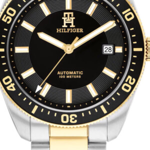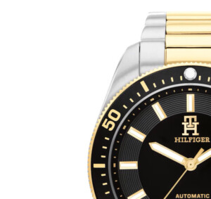 Zegarek męski Tommy Hilfiger model 1710552 prezentuje ekskluzywny design oraz wysoką jakość wykonania, charakterystyczne dla prestiżowej marki Tommy Hilfiger. Jego okrągła koperta o średnicy 40mm, wykonana ze stali szlachetnej pokrytej warstwą PVD/IP w kolorach bicolor: czarnym, srebrnym i żółtego złota, odzwierciedla współczesny, modny styl. Ciemna tarcza harmonijnie współgra z elegancką, metalową bransoletą i mineralnym szkłem chroniącym przed zarysowaniami. Zegarek wyraża ducha marki Tommy Hilfiger, będąc wytwornym dodatkiem podkreślającym modną elegancję i dynamiczny charakter użytkownika.