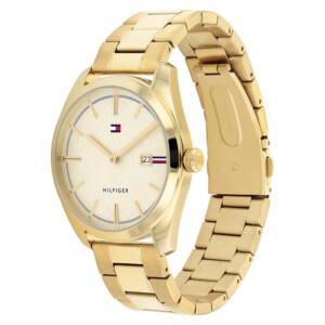 Zegarek męski Tommy Hilfiger, model 1710427, to kwintesencja stylu Fashion, który doskonale łączy w sobie elegancję i nowoczesność. Jego okrągła koperta o średnicy 42 mm wykonana jest z wysokiej jakości stali szlachetnej, a pozłacanie w technologii PVD/IP nadaje wyrafinowanego wyglądu w kolorze żółtego złota. Jasna tarcza zegarka, osłonięta szkłem mineralnym, zapewnia doskonałą czytelność, a bransoleta zwiększa komfort noszenia. Połączenie tych elementów z kultową marką Tommy Hilfiger dodaje prestiżu, czyniąc go idealnym akcesorium dla mężczyzny ceniącego klasykę połączoną z nowoczesnym designem.