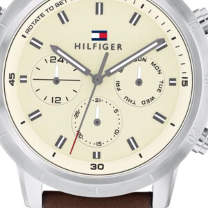 Zegarek męski Tommy Hilfiger model 1792102 to kwintesencja elegancji i nowoczesnego designu, idealny dla mężczyzny, który ceni sobie zarówno styl, jak i funkcjonalność. Piękna, okrągła koperta o średnicy 46mm wykonana ze stali szlachetnej w kolorze srebrnym doskonale komponuje się z jasną tarczą, która zapewnia czytelność. Brązowy, skórzany pasek dodaje klasy i świetnie współgra z każdym strojem, podkreślając modny i wyrafinowany charakter zegarka. Delikatne fluorescencyjne wskazówki i indeksy są nie tylko praktyczne, ale również dodają urządzeniu nowoczesnego wyglądu. Szkło mineralne zabezpiecza przed zarysowaniami, a wodoodporność do 50 metrów umożliwia użytkowanie zegarka podczas pływania powierzchniowego, co czyni go idealnym towarzyszem każdego dnia.