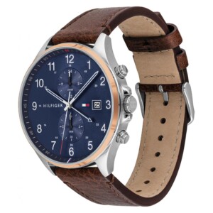 Zegarek Tommy Hilfiger 1791712 West, to model o niezwykłym i unikatowym wzornictwie. Srebrna okrągła koperta posiada szafirową, manualną tarczę z lamówkę w kolorze ciepłego złota. Wszystko stanowi piękną kompozycję podkreśloną brązem skórzanego paska. Model West, posiada duży cyferblat z wyraźnymi cyframi w srebrnej czcionce. Dyskretne tarcze dodatkowych czasomierzy, datownik i logo z nazwą firmy. Delikatne, niewielkie detale w stylu znanym dla projektów Tommy Hilfiger, zostały dyskretnie ukryte pomiędzy punktami godzin i minut, oraz długimi wskazówkami. Pomimo użycia tak wielu elementów, tarcza zegarka 1791712 West, jest dobrze czytelna i bardzo wyraźna.
