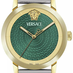 **Zegarek Versace, model VE9G00324, to kwintesencja luksusu i wyrafinowanego stylu włoskiej mody.** Oparty na kwarcowym mechanizmie zasilanym baterią, zapewnia precyzyjność i niezawodność. Zielona tarcza harmonijnie kontrastuje z żółtą kopertą, nadając zegarkowi charakterystycznego, modnego wyglądu. Styl 'Fashion' jest dodatkowo podkreślony przez okrągłą kopertę o średnicy 40 mm i grubości zaledwie 8 mm, co sprawia, że zegarek jest elegancki, a zarazem nowoczesny. Bransoleta dodaje klasy, jednocześnie przemawiając do miłośników stylowych akcesoriów. Zegarek jest także wodoodporny do 50 m, co czyni go idealnym wyborem dla aktywnych, ceniących modę.