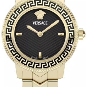 Zegarek Versace model VEUCA0824 to kwintesencja luksusu oraz wyrafinowania, które od lat są synonimami marki Versace. Charakteryzujący się okrągłą, żółtą kopertą ze stali szlachetnej, która pięknie współgra z czarną tarczą, ten zegarek jest zarówno stylowy, jak i elegancki. Średnica koperty wynosząca 30mm idealnie komponuje się na delikatniejszych nadgarstkach, podkreślając subtelność feminityzmu, a elegancką bransoletę z motylkowym zapięciem dopełniają elementy designu. Wodoodporność do 50 metrów dodaje praktycznego aspektu, umożliwiając użytkowanie podczas pływania powierzchniowego, co sprawia, że Versace VEUCA0824 jest doskonałym wyborem dla każdej kobiety ceniącej luksus i funkcjonalność.
