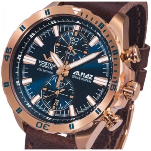 Vostok Europe Almaz jest pozłacanym zegarkiem w kolorze różowego złota stworzonym z myślą o mężczyznach. Doskonale sprawdzi się jako dodatek do eleganckiego lub codziennego ubioru. Wykonany jest ze stali szlachetnej antyalergicznej nie wywołującej reakcji alergicznych lub podrażnień skóry. Posiada okrągłą kopertę o średnicy 47mm oraz ciemną tarczę, która chroniona jest przy pomocy szkła mineralnego odpornego na większość zarysowań oraz stłuczenia. Skórzana bransoleta doskonale dopasowuje się do nadgarstka co dodaje funkcjonalności i estetyki. Zegarek posiada mechanizm kwarcowy (zasilany baterią) oraz jest wodoodporny do głębokości aż 200 metrów co umożliwia użytkownikowi nurkowanie z aqualungiem. Może również sprawdzić się jako zegarek sportowy dzięki wbudowanemu chronografowi/stoperowi który umożliwia bardzo precyzyjny pomiar czasu, datownik który pokazuje konkretny dzień miesiąca oraz fluorescencyjne wskazówki które po uprzednim naświetleniu w dzień świecą w nocy. Vostok Europe Almaz objęty jest 2-letnią gwarancją.