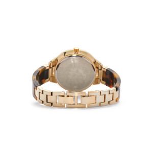 Anne Klein Damskie AK1408CHTO to damski zegarek o ciekawej kolorystyce. Posiada jasną, szampańską tarczę, którą zdobi logo marki. Ring zegarka jak i bransoleta zostały pokryte masą akrylową w stylu bursztynu.