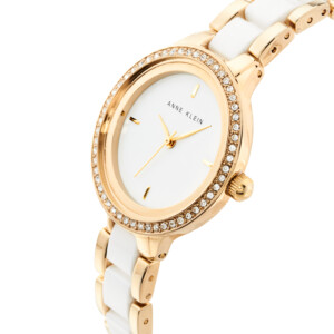 Zegarek damski Anne Klein o numerze modelu AK1418WTGB emanuje elegancją i nowoczesnością, będąc doskonałym wyborem dla kobiet ceniących sobie zarówno styl, jak i jakość. Jego okrągła koperta o średnicy 34mm wykonana jest ze stali szlachetnej, co gwarantuje trwałość oraz ponadczasowy wygląd. Błyszczące zdobienia z cyrkonii i kryształów nadają zegarkowi dodatkowego blasku, podkreślając ekskluzywny charakter. Lśniąca, jasna tarcza harmonijnie komponuje się z elegancką, metalową bransoletą, co czyni zegarek idealnym dodatkiem do każdej stylizacji. Pełniąc funkcję nie tylko praktycznego czasomierza, ale również modnego akcesorium, zegarek ten stanowi wyraz modowego zmysłu marki Anne Klein.
