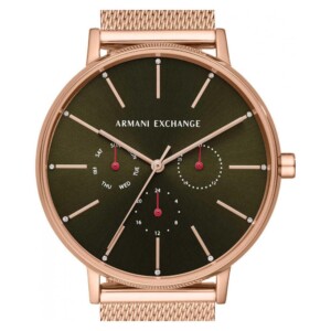 Damski zegarek Armani Exchange, model AX5555, łączy w sobie elegancję i nowoczesność, charakterystyczne dla marki słynącej z modowego podejścia do designu. Jego ciemna tarcza doskonale kontrastuje z okrągłą kopertą oraz pozłacaną bransoletą w kolorze różowego złota, co nadaje całości luksusowego wyglądu. Szkło mineralne i obudowa ze stali szlachetnej gwarantują trwałość i odporność na uszkodzenia. Stylowy wygląd i wyrafinowanie tego modelu sprawiają, że jest to idealny wybór dla kobiet, które cenią sobie modę i jakość.