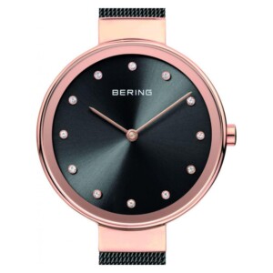 Zegarek damski Bering o numerze modelu 12034-166 to kwintesencja elegancji w modernistycznym wydaniu, doskonale odzwierciedlająca charakter marki Bering, której produkty są synonimem nie tylko jakości ale również subtelnej mody. Zaimplementowany mechanizm kwarcowy gwarantuje precyzyjne odmierzanie czasu, a połączenie ciemnej tarczy z okrągłą, pozłacaną w kolorze różowego złota kopertą podkreśla unikalny, fashionowy styl. Dodatkowym atutem jest szafirowe szkło, odporne na zarysowania, co czyni zegarek niezwykle praktycznym. Stal szlachetna użyta do wykonania koperty oraz bransolety zapewnia trwałość, a całość dopełnia wyrafinowany kontrast między czernią a różowym złotem.