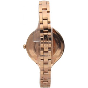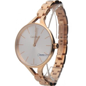 Damski zegarek Calvin Klein K7E23646 to propozycja bardzo kobiecego czasomierza na specjalne okazję. Jego kobiecość wynika głównie z zaproponowania go w kolorze różowego złota, który za pomocą metody PVD naniesiono na antyalergiczną i odporną na korozję stal szlachetna. Nieszablonowy design tego damskiego modelu opiera się głównie o stalową bransoletę, którą tworzą drobne ogniwa uchodzące ku klasycznemu zapięciu. Centrum czasu tego czasomierza jest analogowa tarcza, na której czas wskazywany jest za pomocą kwarcowego, szwajcarskiego mechanizmu, którego motorem napędowym jest bateria, a żywotność jej określana jest na około 2 lata.