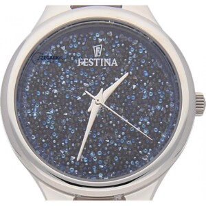 Skórzane mocowanie, delikatna koperta i rozświetlony cyferblat to główne cechy charakterystyczne damskiego zegarka Festina F20334/2. Element stale dotykający skórę, czyli koperta, wykonany został ze stali szlachetnej, głównie z uwagi na właściwości antyalergiczne. Skórzany, granatowy pasek idealnie dopasowuje się do nadgarstka, pozwalając czuć się komfortowo przy każdym ruchu nadgarstka. Mimo, iż wymienione elementy są niezwykle ważne to jednak najbardziej nasz wzrok w zegarku Festina F20334/2 przyciąga analogowa tarcza, wypełniona migoczącymi kryształami Swarovskiego. Zarówno one, jak i drobne wskazówki zamknięto pod szkłem mineralnym, aby stale zachwycały swoim designem. Zauważyć musimy, że mimo dużego blasku odczytanie godziny jest bardzo łatwe. Odpowiada za nią kwarcowy mechanizm, ceniony na rynku zegarmistrzowskim za dużą dokładność.