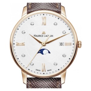Chyba niemożliwym jest, aby wybrać jeden, najbardziej gustowny i ciekawy element zegarka Maurice Lacroix EL1096-PVP01-150-1 co potwierdza, iż tworzenie każdego detalu było dokładnie przemyślane, a dbałość o szczegóły popłaciła wysokim zainteresowaniem tym modelem wśród kobiet w każdym wieku. Okrągła koperta pozłacana różowym złotem, skórzany, brązowy pasek i biała, lakierowana tarcza to najbardziej istotne elementy pod względem użytkowania. Mocowanie zakończone zapięciem na sprzączkę pozwala na łatwe dopasowanie go do nadgarstka. Koperta wykonana ze stali szlachetnej to bezpieczeństwo nawet najbardziej delikatnej skóry, a jednocześnie sposób na zapomnienie o podrażnieniach czy reakcjach alergicznych. Jasny cyferblat wypełniony ośmioma diamentami oraz cyframi rzymskimi to pewność łatwego odczytania aktualnej godziny. Skoro mowa już o czasie to warto wiedzieć, iż w zegarku Maurice Lacroix EL1096-PVP01-150-1 odpowiada za niego bardzo dokładny mechanizm kwarcowy, którego pracę obserwujemy poprzez ruchu pozłacanych wskazówek. Co ciekawe, ten damski czasomierz jest sposobem na idealny wygląd w każdej sytuacji, takiej jak na przykład romantyczny połów ryb z wybrankiem serca. Możliwe jest to zarówno dzięki funkcji faz księżyca, jak i wodoodporności plasującej się na poziomie 50 metrów, pozwalającej na powierzchowne pływanie.