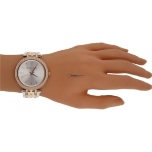Przedstawiamy Państwu niezwykle interesujący czasomierz damski Michael Kors MK3203 pochodzący z oferty jednego z najbardziej znanych i cenionych projektantów świata mody. Model ten wykonany został z antyalergicznej stali szlachetnej, którą pokrytą warstwą pozłacania. Dzięki zabiegowi jonizacji (IP) koperta i bransoleta czasomierza mogą poszczycić się wyrazistym odcieniem złota łączonym z elementami surowej stali. Taka kompozycja trikoloru (różowe i żółte złoto oraz stal), popularna m.in. w projektach Cartiera gwarantuje bardzo ciekawe wrażenia wizualne i sprawia, że czasomierz ten doskonale prezentuje się na ręku. Ponadto zegarek MK3203 ze względu na swoją dużą kopertę, przełamuje stereotyp modelu biżuteryjnego i pasuje zarówno do kreacji wyjściowych jak również zestawów bardziej codziennych dobieranych np do pracy. Zachęcamy do zapoznania się z tym wspaniałym czasomierzem, który bez wątpienia skradnie Wasze serca.