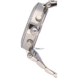 Chronograficzny zegarek posiada tarczę oraz kopertę ozdobioną cyrkoniami.