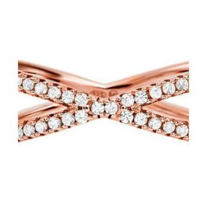 Srebrny pozłacany różowym złotem pierścionek ozdobiony kryształkami.