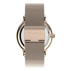 Zegarek Timex model TW2T74500 Transcend przeznaczony jest dla pań w każdym wieku. Złoty cyferblat, złoty pasek, piękna jakość, świetna czytelność. Mechanizm kwarcowy skryty jest w kopercie ze stali. Meshova bransoleta to elegancja. Analogowy cyferblat został okryty szkłem mineralnym, które ma idealną trwałość, wolno rysuje się i długo przetrwa. Wodoszczelność zegarka to 50 metrów. Szlachetna stal jest trwała, nie uczula, nie alergizuje. Jakość w dobrej cenie jest dokładnie tym, czego oczekują modne panie. Wysoka jakość, solidność, trwałość oraz elegancja zegarka sprawdza się idealnie. Klientki noszą taki zegarek do kobiecych sukienek oraz codziennych kreacji. Jest on rodzajem biżuterii - zdobi i pokazuje czas. Trzyletnia gwarancja pomaga w sytuacjach uszkodzeń oraz usterek. Taki zegarek to piękno, jakość, doskonałość. Niewiele ponad 420 złotych można spokojnie wydatkować, aby zdobyć piękny czasomierz w świetnej cenie. Warto o tym pamiętać, warto napawać się takim zegarkiem w cenie nader umiarkowanej. Koperta - stal koloru różowo-złotego.