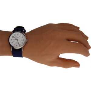 Timex Weekender TW2P65800 to model damski wykonany z wysokiej jakości materiałów. Posiada materiałowy, granatowy pasek, który współgra ze stalową kopertą. Na jasnej tarczy widoczne są arabskie cyfry i indeksy,