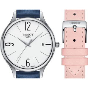 Zegarek Tissot T103.210.16.017.00 to bardzo kobiecy, lecz prosty czasomierz, w którym szczególne znaczenie odgrywa mocowanie. Owszem, pozostałe zewnętrzne elementy są ważne, jednak to właśnie skórzany pasek urozmaica stylistykę stonowanej koperty. Co najbardziej istotne, model ten posiada dwa mocowania, jeden z nich to skórzany, niebieski pasek, natomiast drugi zachwyca swoim delikatnym, różowym kolorem. Dwa łatwo wymienne mocowania to sposób na codzienną zmianę wyglądu swojego czasomierza, idealnie wpasowując go do stylizacji na wiele okazji, a także bez okazji.