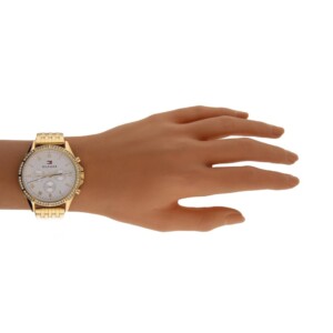 Damski zegarek Tommy Hilfiger Ari 1782142 to połączenie elegancji, oryginalnego designu i solidności. Koperta oraz bransoleta wykonane z antyalergicznej stali w kolorze złotym współgrają ze srebrną, analogową tarczą. Całości dopełniają ozdobne kryształki.