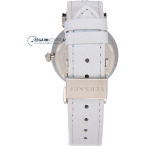 Tarcza biała ze szlifem słonecznym oraz greckim wzorem; rzymskie cyfry; logo Versace na godzinie 12