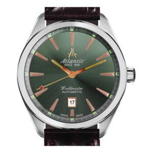 Zegarek Atlantic Worldmaster męski 53750.41.41R wyposażony jest w okrągłą kopertę wykonaną ze srebra. Średnica koperty wynosi 42 mm. Klasyczna okrągła , analogowa tarcza w kolorze zielonym. Na traczy umieszczony został datownik wskazujący, dzień miesiąca. Tarcza została pokryta szkłem szafirowym , które uzyskało 9/10 punktów w skali Mohsa, jest możliwe do zarysowania jedynie diamentem. Jest wysoce odporne na uszkodzenia mechaniczne, zarysowania. Zaopatrzony został w elegancki brązowy pasek skórzany . Pasek jest bardzo miękki, świetnie się otrzymuje na ręce. Jego przeciętna żywotność wynosi 6-9 miesięcy, można ją wydłużyć stosują odpowiednie preparaty. Klasa wodoodporności zegarka daje możliwość pływania powierzchniowego . Zegarek Atlantic Worldmaster męski 53750.41.41R posiada bardzo cenioną funkcję flurosencyjnych wskazówek, które uławiają odczytanie godziny w ciemności. Posiada rezerwę chodu, działa również , kiedy jest zdjęty z nadgarstka. Zegarek jest antyalergiczny, przyjazny dla skóry.Gwarancja udzielona na 2 lata, rozpatrywana jest w autoryzowanych serwisach producenta.