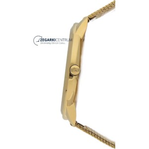 Kolor żółtego złota dominuje w zewnętrznych elementach zegarka Calvin Klein K3M2T526, takich jak okrągła koperta o średnicy 43 milimetrów oraz meshowa bransoleta z zapięciem g-link wykonanych z antyalergicznej oraz odpornej na korozję stali szlachetnej. Zupełnie prosta, analogowa tarcza idealnie komponuje się z tymi elementami, głównie z uwagi na umieszczone na niej detale- indeksy liniowe oraz wskazówki, które pomagają nam w szybkim odczytani odpowiedniej godziny nawet w największym pośpiechu. Użytkowanie zegarka Calvin Klein K3M2T526 podczas wielu nawet codziennych czynności jest nie tylko przyjemne, ale również wręcz polecane, a to wszystko za sprawą jego dokładności, którą zapewnia nam szwajcarski, kwarcowy mechanizm napędzany baterią.