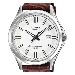 Zegarek męski Casio model MTS-100L-7A łączy w sobie elegancję z klasyczną estetyką, idealnie odzwierciedlając wartości, które od lat są synonimem marki Casio. Srebrna, okrągła koperta ze stali szlachetnej ma średnicę 40 mm, która harmonizuje z jasną tarczą oraz stylowym, brązowym paskiem skórzanym, nadając zegarkowi ponadczasowy charakter. Szkło szafirowe, znane ze swojej odporności na zarysowania, gwarantuje trwałość i czytelność w każdych warunkach. Dodatkowym atutem tego modelu jest jego wodoodporność do 50 metrów, co umożliwia korzystanie z jego funkcji nawet podczas pływania powierzchniowego. Elegancja i wysoka jakość wykonania czynią ten model Casio wyborem dla mężczyzn, którzy cenią sobie zarówno styl, jak i funkcjonalność.