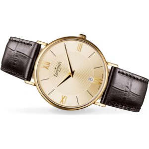 Zegarek męski Davosa o modelu 162.486.35 to wykwintne połączenie funkcjonalności i estetyki, idealne dla dżentelmena ceniącego klasyczną elegancję. Wyrafinowana, szampańska tarcza nadaje ponadczasowy styl, który doskonale harmonizuje z okrągłą, pozłacaną na żółte złoto kopertą o średnicy 38 mm. Luksusowe wykończenie w technologii PVD/IP i wodoodporność na poziomie do 50 metrów sprawiają, że jest to równie praktyczny, co stylowy dodatek. Wysokiej jakości szkło szafirowe gwarantuje odporność na zarysowania, a elegancki, skórzany pasek zamyka całość na najwyższym poziomie. Zegarek Davosa jest wyrazem doskonałości, podkreślającym prestiż i gust swojego właściciela.