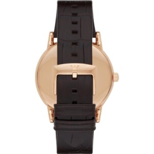 Emporio Armani AR2502 to męski zegarek o nowoczesnym, a jednocześnie klasycznym designie. Prezentuje styl, który najlepiej ujmuje słowo "ponadczasowy". Jego stalowa koperta w kształcie koła o średnicy 42mm współgra z zamocowanym na teleskopach paskiem skórzanym. Odcień różowego złota doskonale pasuje do ciemnobrązowej skóry, co daje interesujący efekt i pozwala dopasować czasomierz do strojów na różne okazje. Elementem, który tonuje całość jest jasna analogowa tarcza wzbogacona indeksami,wskazówkami i logotypem zachowanymi również w odcieniu rose gold. Cyferblat zegarka AR2502 jest bardzo wyraźny i czytelny. Z łatwością odczytać można go nawet w ciemności, przez co nadaje się dla mężczyzn w każdym wieku. Tarczę chroni mineralne szkło odporne na stłuczenia. Wewnątrz stalowej koperty pracuje mechanizm japoński, kwarcowy, który zasila bateria. Całość prezentuje się doskonale tworząc ciekawy efekt, obok którego nie można przejść obojętnie.