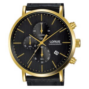 Kolor żółtego złota, coraz bardziej powszechny w męskich modelach, zdobi okrągłą, smukłą kopertę zegarka Lorus RM332FX9, nadając jej luksusu i wyrafinowania. Co prawda stworzona została z antyalergicznej stali szlachetnej, a kolor naniesiono na nią metodą PVD ale jednam mimo wszystko mamy pewność, że powłoka odporna jest na ścieranie. Złoto znajdziemy również na tarczy, gdzie indeksy liniowe i wskazówki w tej barwie kontrastują z ciemnym tłem cyferblatu. Co ciekawe, styl tego czasomierza to zdecydowanie fashion, ale wyposażono go w funkcje przypisywane sportowym modelom, takie jak chronograf znany również jako stoper. Z uwagi również na ta funkcję przydatną do mierzenia czasu zegarek Lorus RM332FX9 wyposażono w dokładny mechanizm kwarcowy. Czarny, skórzany pasek pozwoli idealnie dopasować ten czasomierz do swojego nadgarstka, podkreślając komfort użytkowania.
