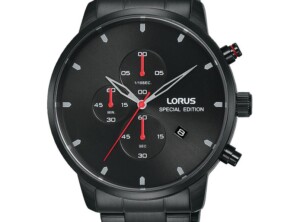 Duża koperta to element, który przyciąga uwagę. To właśnie w niej zamknięto kwarcowy mechanizm, który odpowiada za wszystkie funkcje zegarka Lorus RM329FX9, czyli chronograf, stoper oraz datownik. Wszystkie dane wskazują interesujące, czerwone wskazówki, które niewątpliwie kontrastują z czarną tarczą. Perfekcyjnie odmierzony czas określają indeksy liniowe oraz wskazówki już w niego stonowanej, szarej wersji lecz najważniejsze jest to, że są czytelne, a odczytanie danych jest proste.