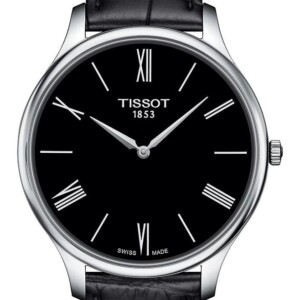 Chcąc dokładnie poznać zegarek Tissot T063.409.16.058.00 warto przyjrzeć się bliżej jego zewnętrzny elementom. Mocowanie tego modelu to czarny pasek wykonany z tłoczonej skóry bydlęcej. Wyposażono go z najbezpieczniejsze zapięcie motylkowe, na którym wygrawerowano logotyp producenta. Koperta stworzona została z antyalergicznej i niekorozyjnej stali szlachetnej, a jej największą zaletą jest smukłość. Jej średnica wynosi 39 milimetrów, jednak grubość to niespełna 5.5 milimetrów. Tak idealnie dobrane kształty gwarantują nam wysoki komfort użytkowania, gdy zdecydujemy się połączyć go z koszulą typu slim, całkowicie zapominając o zahaczaniu mankietów. Jako zabezpieczenie tarczy zegarka Tissot T063.409.16.058.00 wykorzystano odporne na zarysowania szkło szafirowe. Czarny cyferblat uzupełniono srebrnymi wskazówkami, cyframi rzymskimi oraz indeksami liniowymi, otrzymując tym samym bardzo przejrzystą i czytelną tarczę, bez zbędnych urozmaiceń, co docenią mężczyźni o słabszym wzroku. Wspomniana już wcześniej perfekcja rejestrowania czas możliwa jest dzięki szwajcarskiemu sercu, kwarcowemu mechanizmowi napędzanemu baterią. Bez wątpienia ten męski czasomierz to propozycja dla każdego mężczyzny, chcącego podkreślić swój gust pełen klasy i dobrego smaku.