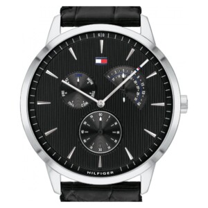 Kolorystyka zegarka Tommy Hilfiger 1710391 opiera się głównie o czerń, a mimo to czasomierz ten wyróżnia się na tle propozycji innych marek fashion. Tworząc jego cyferblat postawiono na czytelność, dlatego do ciemnego tła tarczy dobrano jasne indeksy, które kształtem przypominają ostrza skierowane ku prostym wskazówkom. Dodatkowe subtarcze nie określają danych z sportowych funkcji, a jedynie z datownika pokazującego obecny dzień tygodnia oraz miesiąca. Co ciekawe, w zegarku Tommy Hilfiger 1710391 postanowiono oddzielić tarczę sekundową i umieścić tuż nad godziną trzecią, co dodatkowo urozmaica cyferblat. Czasomierz ten idealnie sprawdzi się jako dodatek do eleganckich, jak i casualowych stylizacji. Mimo, iż przepełniony jest modnymi detalami to jego główne elementy, skórzany pasek i stalowa koperta, wykonane zostały w ponadczasowym stylu, wpasowującym się w każdą sytuację.