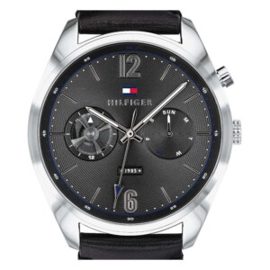 Zegarek Tommy Hilfiger Deacan 1791548 wykonany został z antyalergicznej stali chirurgicznej, odpornej na rdzewienie. Czarna analogowa tarcze z indeksami oraz cyframi arabskimi. Okrągła koperta o średnicy 48 mm. Posiada rozbudowany datownik, w każdej chwili można sprawdzić aktualną datę. Mineralne szkiełko chroni tarczę, jest uszkodzeniem i zarysowaniem. Wyposażony został z kwarcowy mechanizm, zasilany baterią kwarcową. Pasek w czarnym kolorze wykonany z miękkiej skóry naturalnej został dobrze wyprofilowany, stabilnie układa się na ręce.