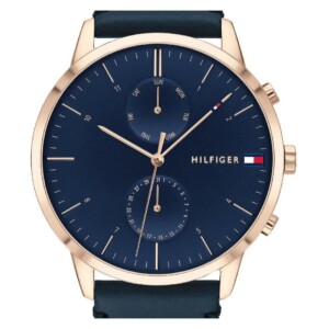 Zegarek Tommy Hilfiger Evan 1710405 łączy w sobie elegancki i sportowy styl. Czasomierz posiada wytrzymałą okrągłą 44 mm kopertę ze stali szlachetnej w różowo-złotym kolorze z granatową tarczą. Uzupełnia ją skórzany pasek w kolorze tożsamym z tarczą. Model ten posiada zasilany baterią mechanizm kwarcowy o wysokiej precyzji. Maksymalny margines błędu w skali jednego miesiąca wynosi zaledwie od -15 do +21 sekund, w związku z czym zegarek nie wymaga częstego regulowania. Czasomierz posiada wysoką klasę wodoodporności na poziomie 50 m dzięki czemu bez problemu można z niego korzystać podczas aktywności sportowej takiej jak np pływanie. Tarcza zegarka posiada ochronę w postaci odpornego na stłuczenia mineralnego szkiełka. Stalowy materiał posiada tylko nieznaczne domieszki niklu, dzięki czemu jest bezpieczny także dla alergików. Wśród dodatkowych funkcji zegarek Tommy Hilfiger Evan 1710405 znajduje się także datownik wyświetlający dokładną datę. Kolory zegarka zachowują trwałość przez długi czas dzięki użyciu próżniowej metody PVD/IP podczas jego nakładania.
