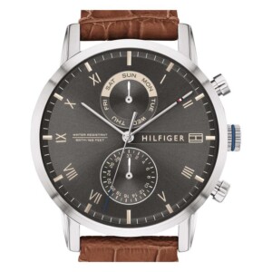 Męski zegarek Tommy Hilfiger Kane 1710398 wyróżnia się na tle innych modeli nietypowym zestawieniem kolorów. Koperta o średnicy 44 mm została wykonana ze stali chirurgicznej (antyalergicznej) i stanowi jasną otoczkę dla kolistej tarczy w kolorze grafitowym (ciemnoszarym). Na matowym tle wyróżniają się swoim blaskiem znaczniki godzinowe i minutowe oraz proste, nieskomplikowane wskazówki. Numeracja rzymska to dla oka miła odmiana i alternatywa dla typowych analogowych zegarków, gdzie pojawiają się cyfry arabskie. Tracza została wyposażona w datownik multifunctions, który umożliwia dokładne odczytanie daty (dzień i miesiąc). Dla ożywienia szarości tarczy na wskazówkach pojawiają się barwy firmowe Tommy Hilfiger. Ciekawym kontrastem dla stalowej koperty jest brązowy, skórzany pasek z nietypowym, tłoczonym wzorem przypominającym fakturą ułożone jednak na drugiej cegły. Tommy Hilfiger Kane 1710398 nadaje się do codziennych stylizacji modowych, które stawiają na wygodę i swobodę noszenia. Zegarek objęty się dwuletnią gwarancją producenta.