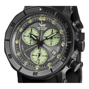 Tarcza zegarka Vostok Europe Lunokhod 6S306204212 jest podzielona na trzy obszary, na których znajdują się mniejsze tarcze w zielonkawym kolorze. Chronograf - popularnie zwany stoperem pozwala na precyzyjny pomiar czasu. Jest to bardzo przydatna funkcja, zwłaszcza podczas uprawiania sportu. Model ten sprawdzi się nawet w sportach wodnych, gdyż jest wodoodporny i odporny na ciśnienie nawet do głębokości 300 m. Tarcza posiada funkcję podświetlenia i jest to podświetlenie trytowe typu GTLS. Zegarek został również wyposażony w dyskretny datownik, umieszczony po prawej stronie tarczy. Model idealny dla każdego miłośnika sportu, który ceni sobie dobrą jakość i estetyczne wykonanie. Spójna kolorystyka pozwala na zachowanie eleganckiego charakteru zegarka.