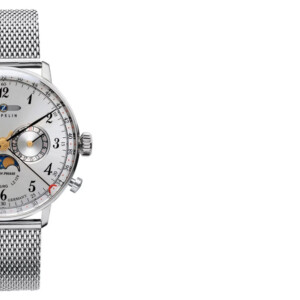 Elegancki męski zegarek Zeppelin model 7036M-1 stanowi doskonałe połączenie klasyki i nowoczesnych technologii. Wytworzony z najlepszej jakości stali szlachetnej, prezentuje okrągłą, srebrzysto-czarną kopertę o średnicy 40 mm, którą przyozdabia błyszcząca bransoleta. Odporność na zachlapania do 30m wraz z wytrzymałym hesalitowym szkłem zapewnia doskonałą trwałość i niezawodność na co dzień. Wyróżnia się elegancką, jasną tarczą z czytelnym datownikiem i fascynującą fazą księżyca, co dodaje zegarkowi nie tylko funkcjonalności, ale i wyrafinowanego charakteru, idealnego dla każdego mężczyzny ceniącego klasykę z nutą prestiżu.